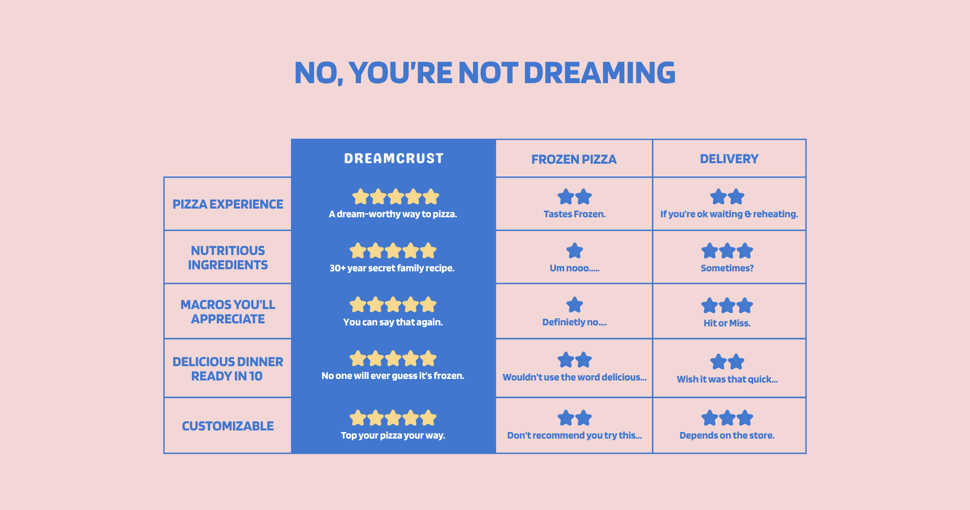 Explore the different worlds of Dreamcrust with an assortment of our Mozzarella Dreamz, Veggie Valley, and Pepperoni Paradise (Plant-based-Pepperoni)