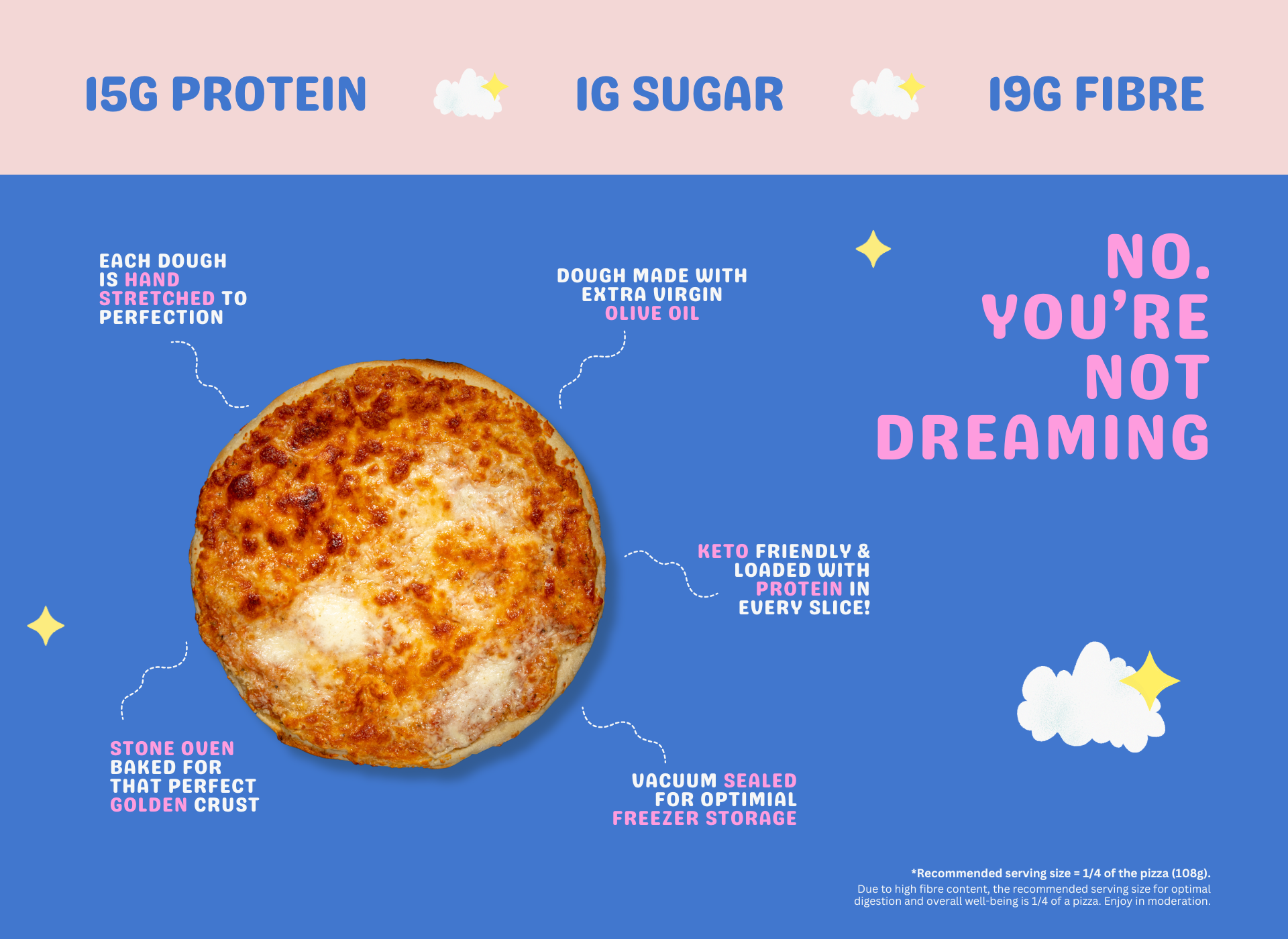 A heaven-like blend of mozzarella cheese layered on top of our secret, god-made tomato sauce recipe. An 11 inch frozen pizza with 60 grams of protein.