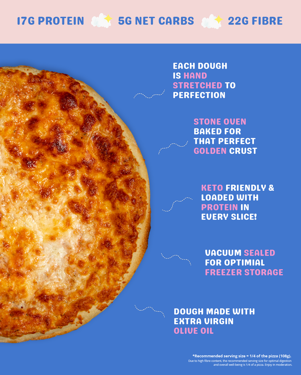 A heaven-like blend of mozzarella cheese layered on top of our secret, god-made tomato sauce recipe. An 11 inch pizza with 68 grams of protein and 20 grams of net carbs.