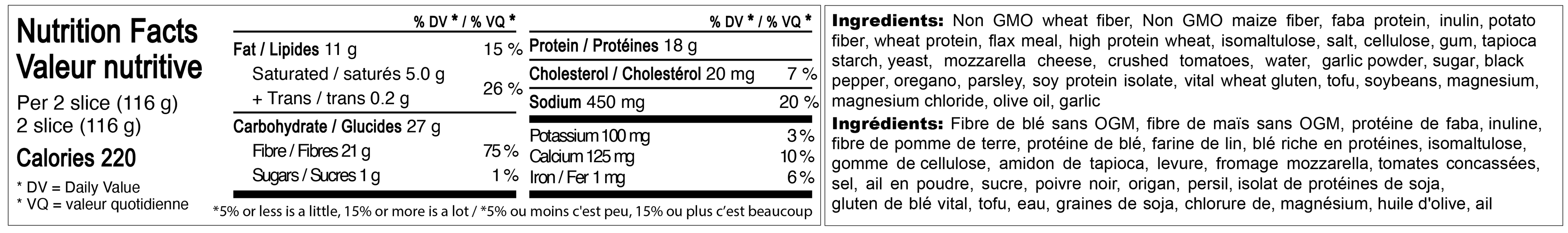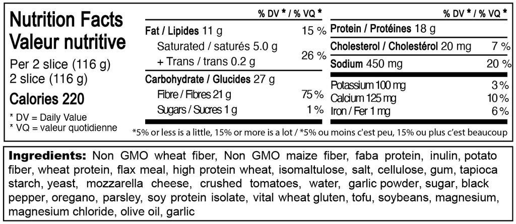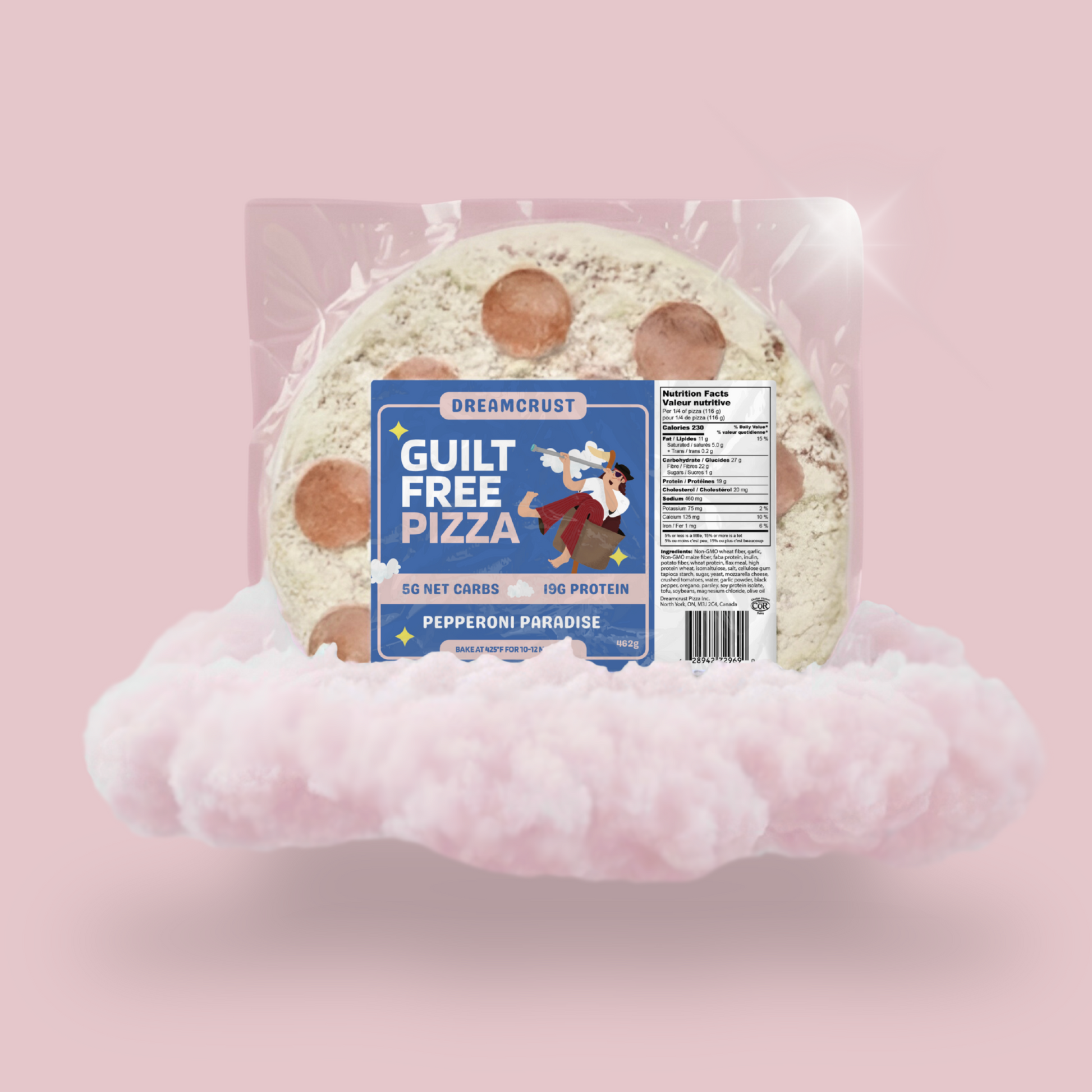 A heaven-like blend of mozzarella cheese layered on top of our secret, god-made tomato sauce recipe with a waterfall of mystical plant-based pepperoni slices. A dreamworthy, 11-inch, guilt-free pizza with 76 grams of protein, 20 grams of net carbs.
